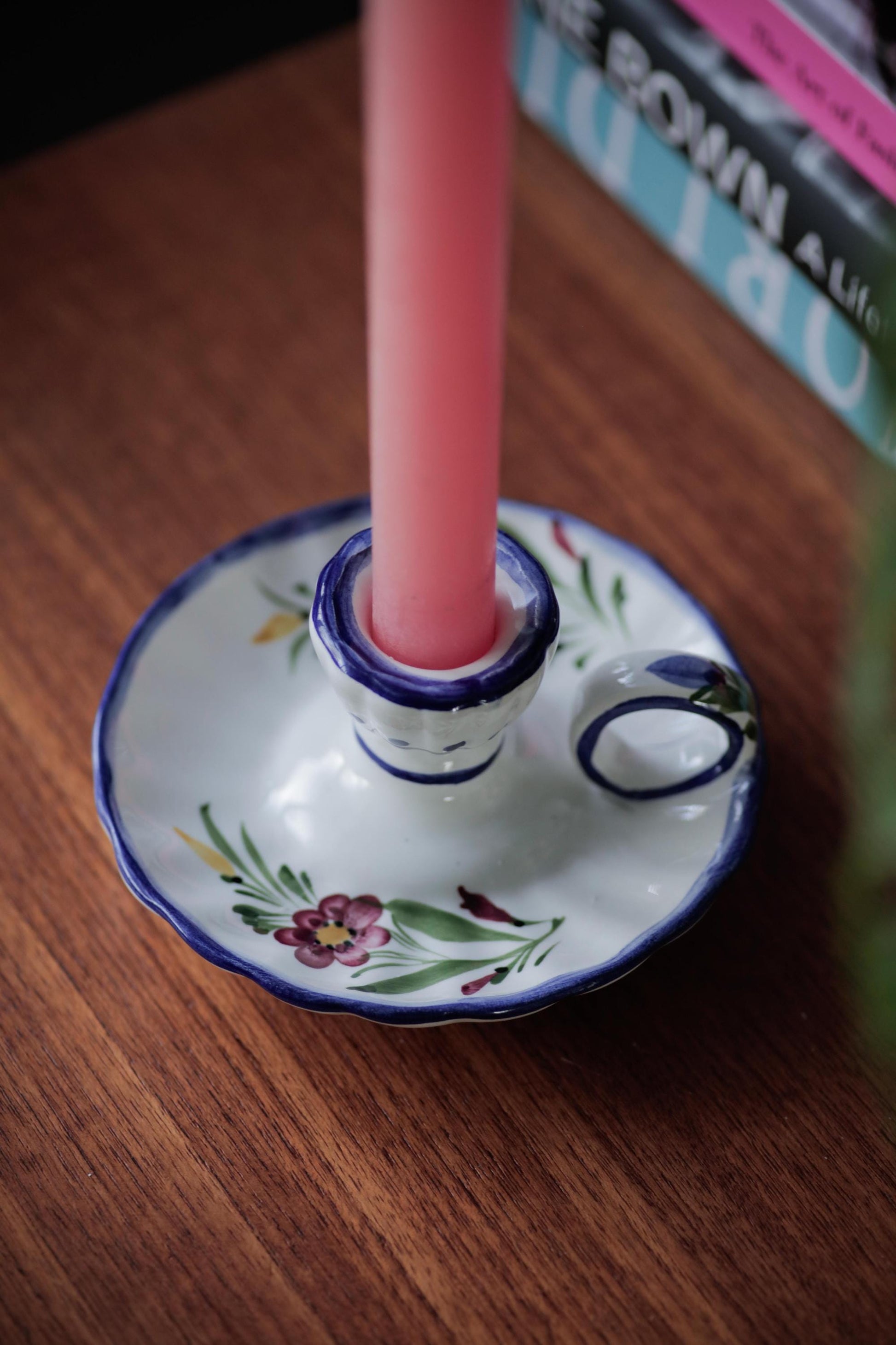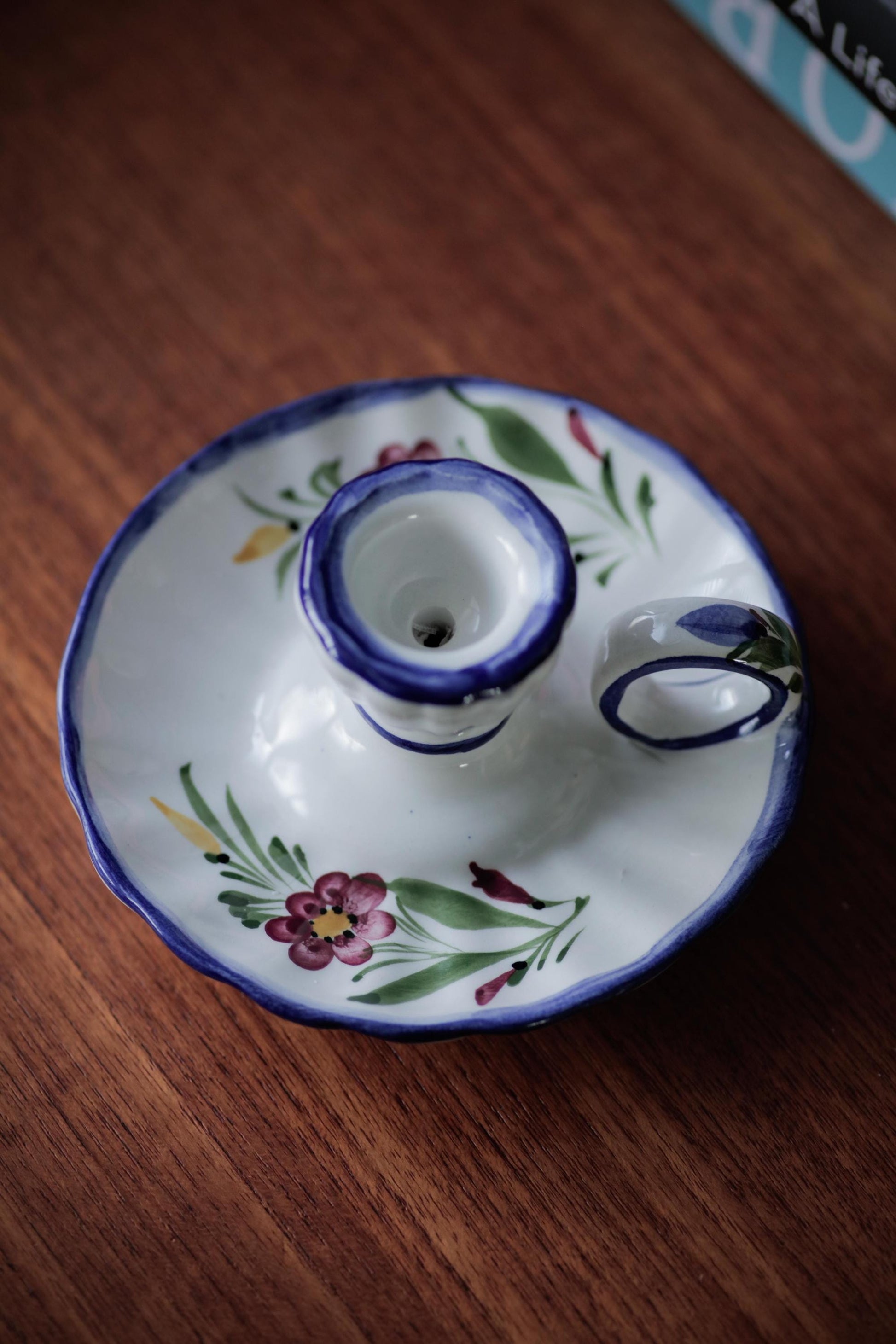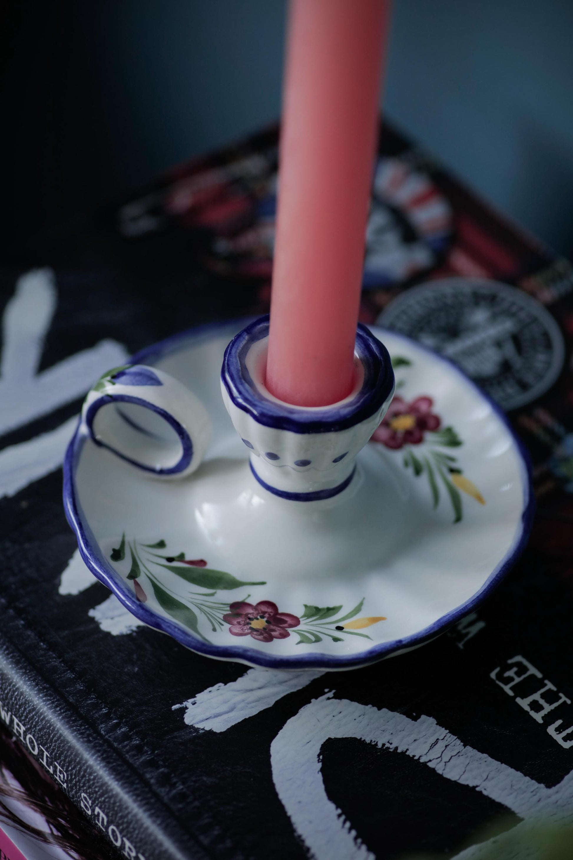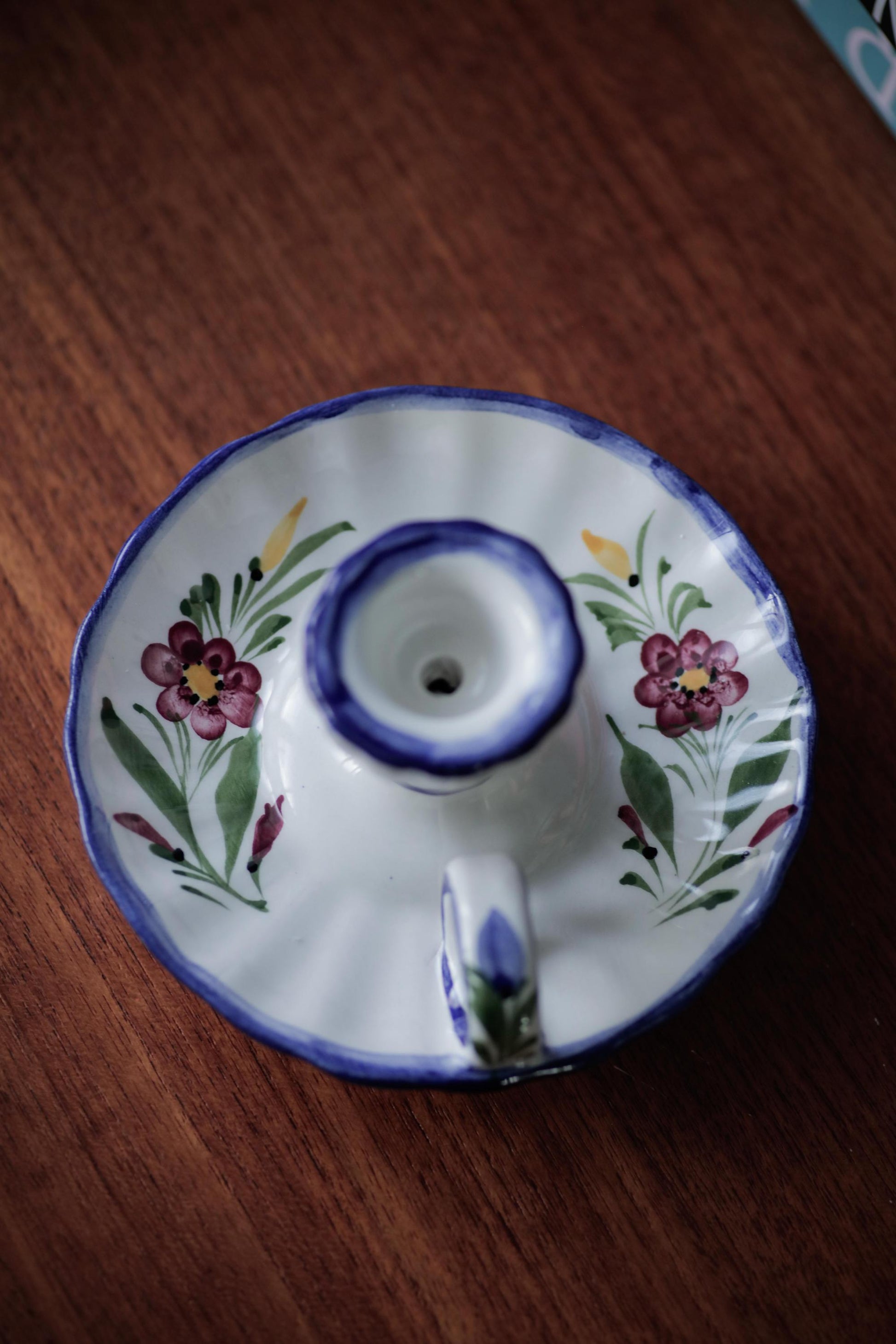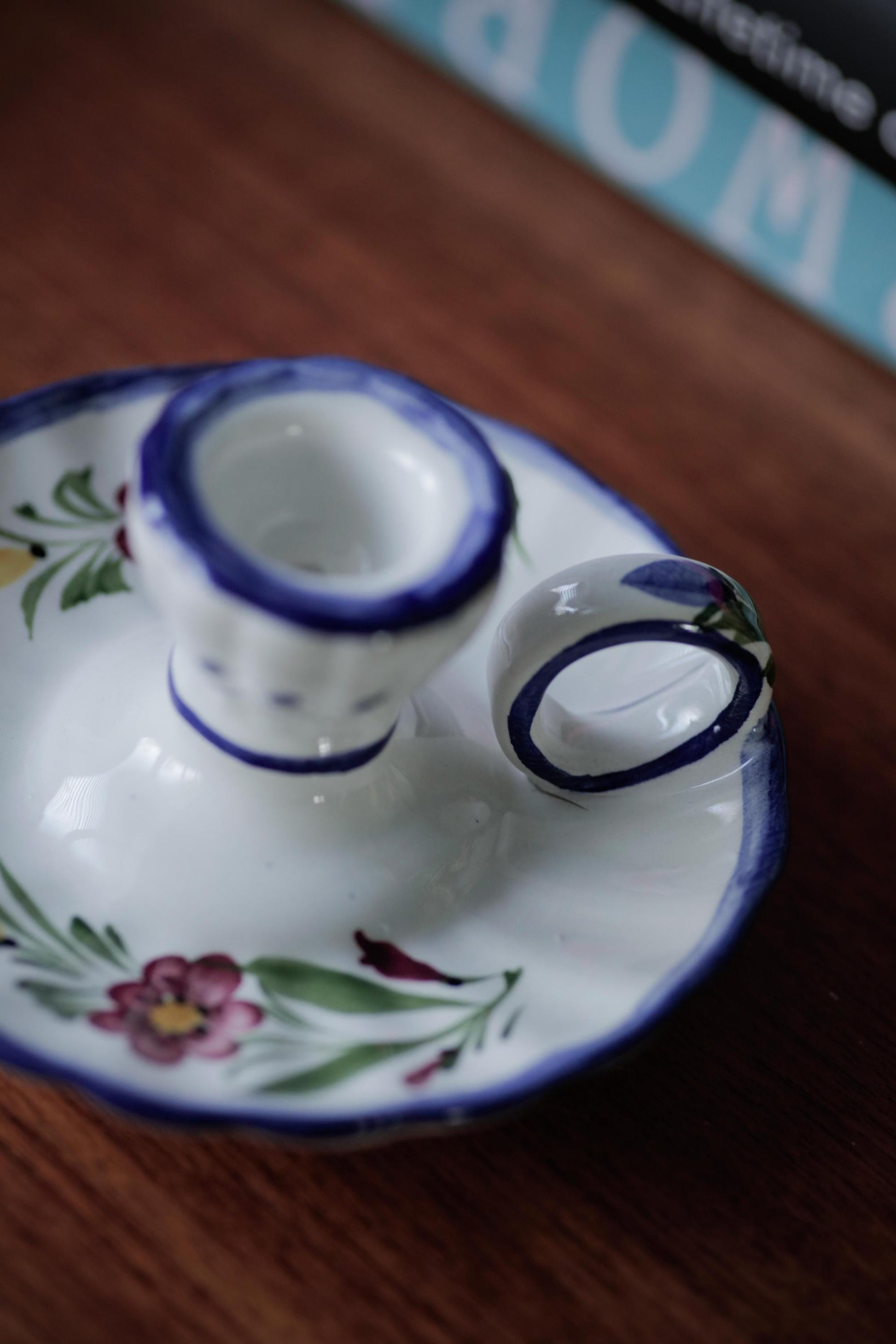 Chamber Vintage Candlestick Holder with handle handmade and hand-painted white and blue glaze wee willie winkie candle holder