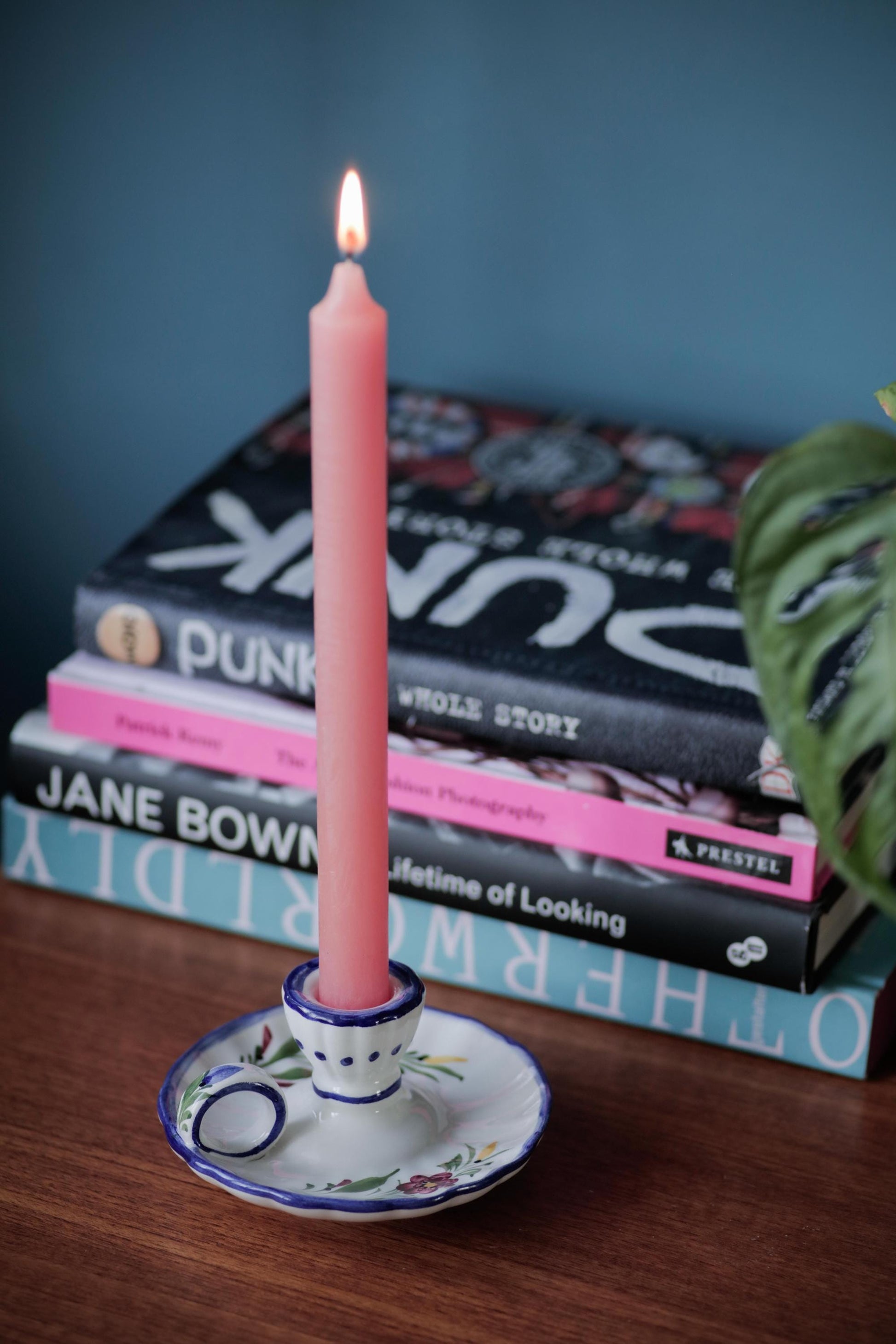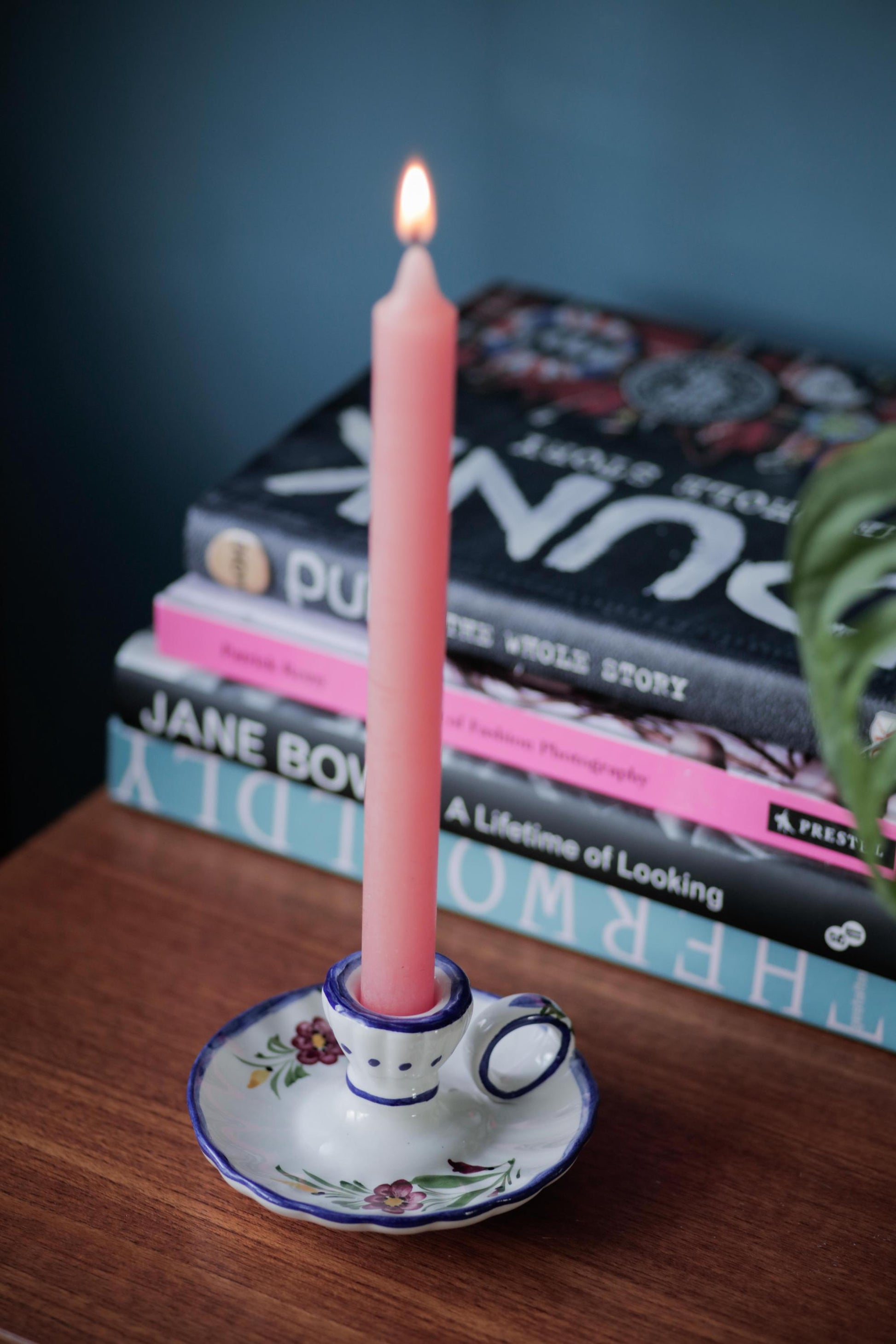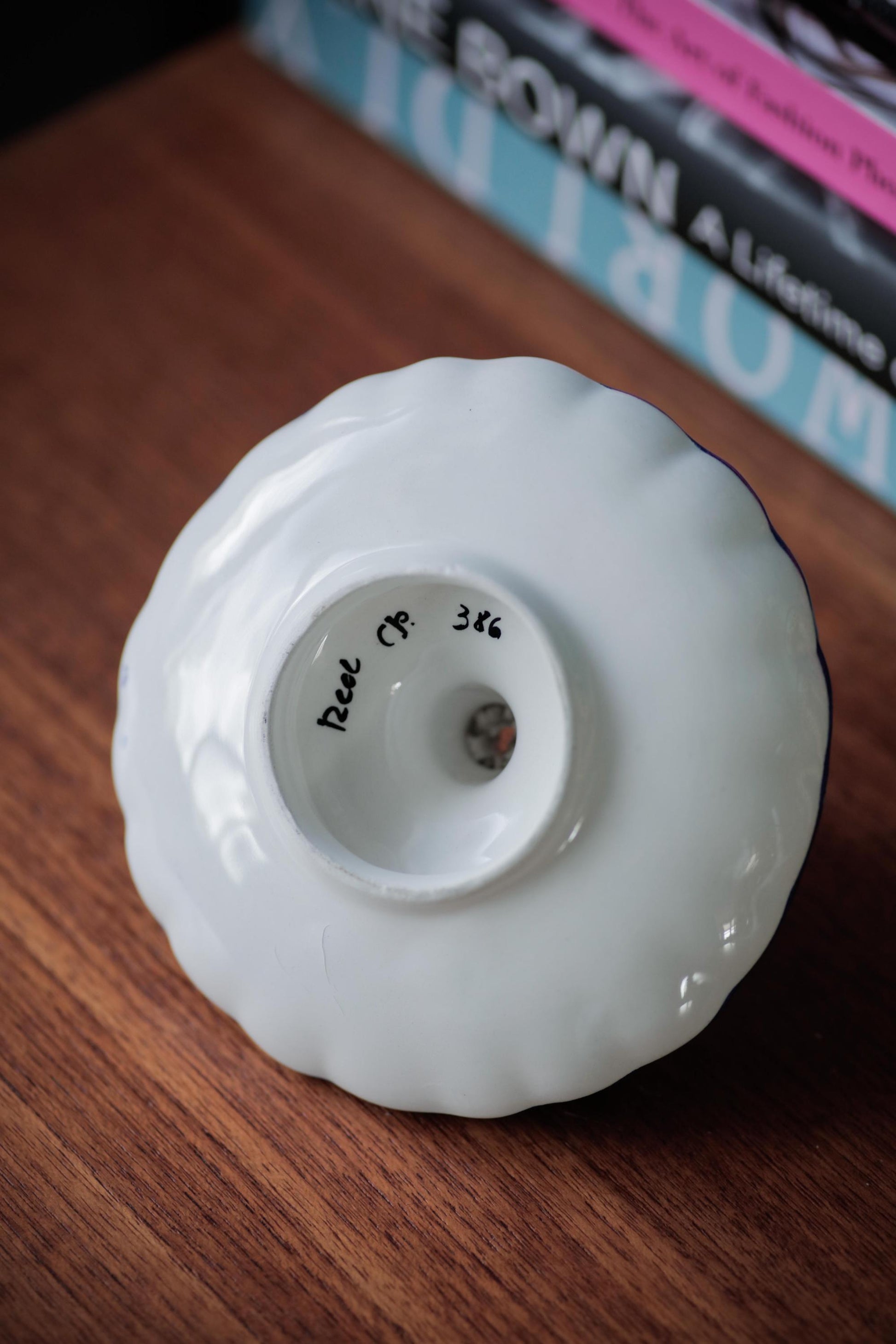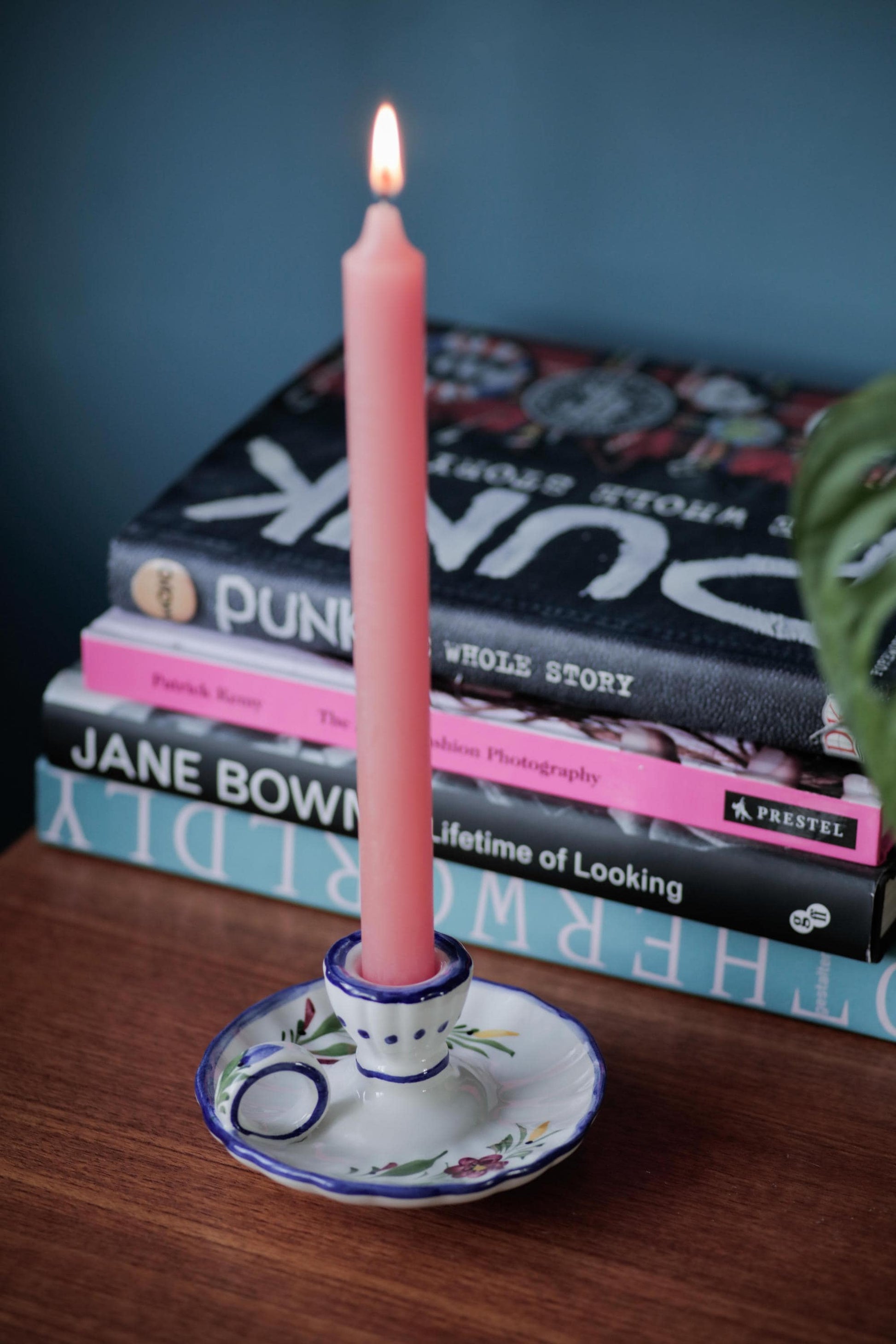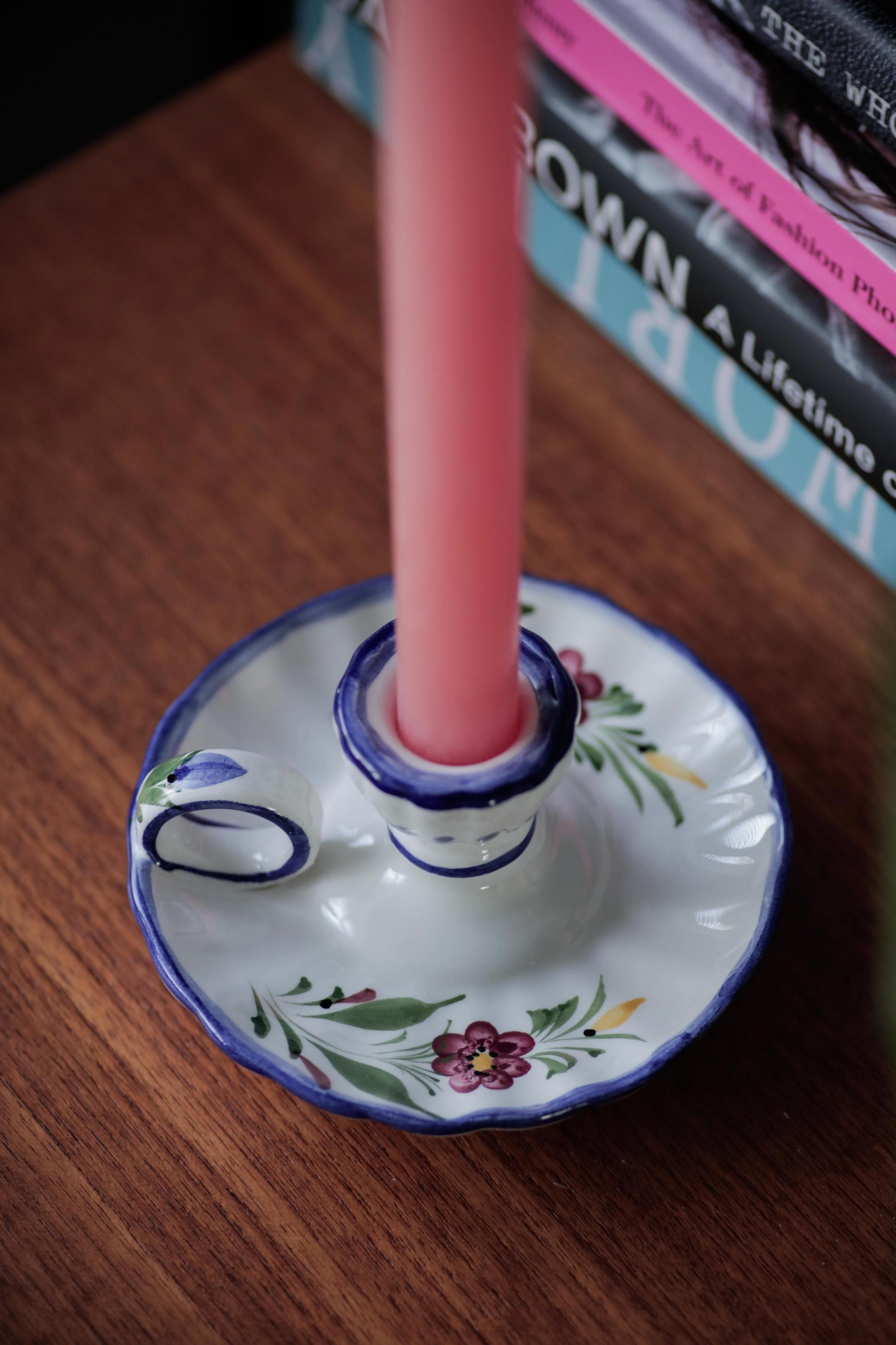 Chamber Vintage Candlestick Holder with handle handmade and hand-painted white and blue glaze wee willie winkie candle holder