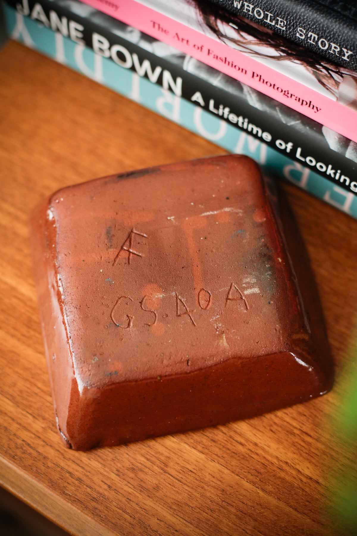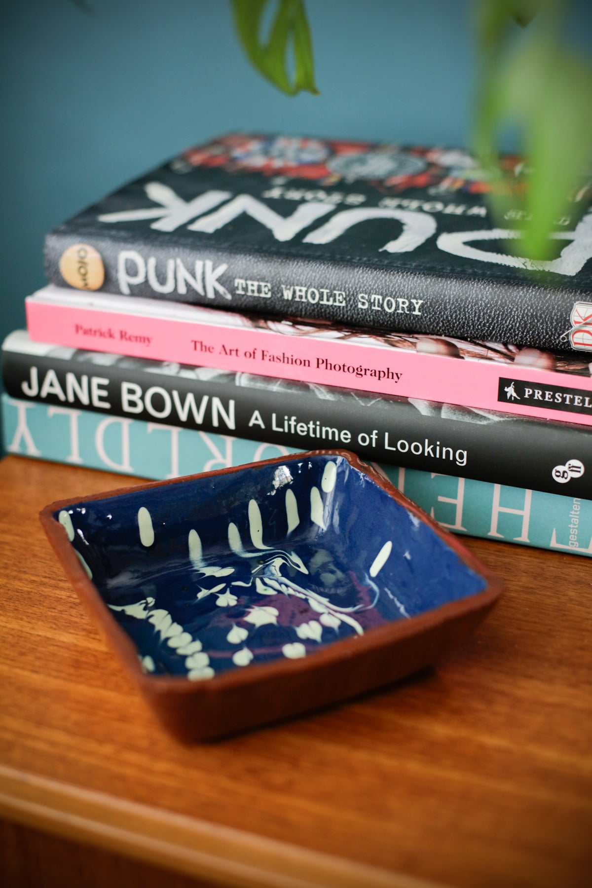 Gorgeous handmade decorative dish / square bowl with a dark blue glazing and light minty green pops in the design.