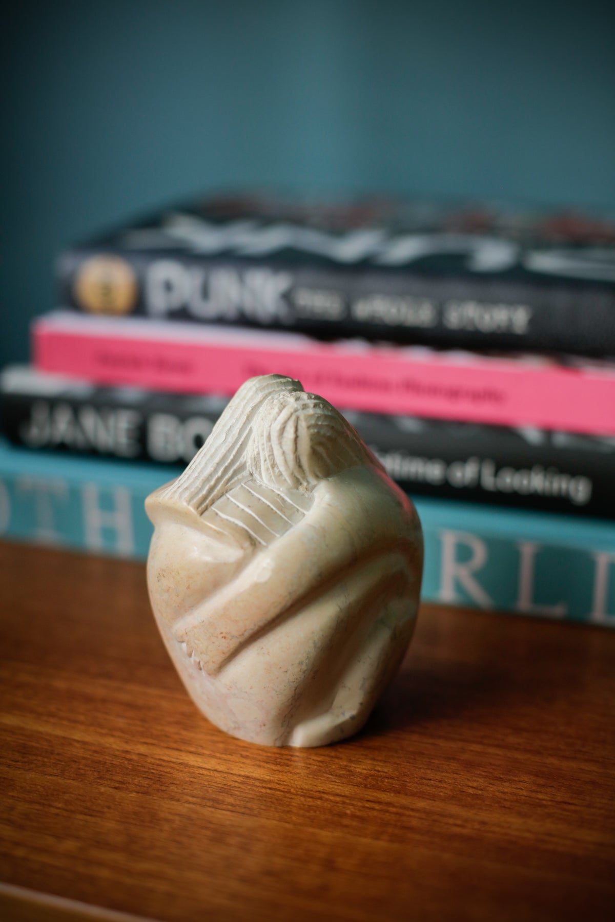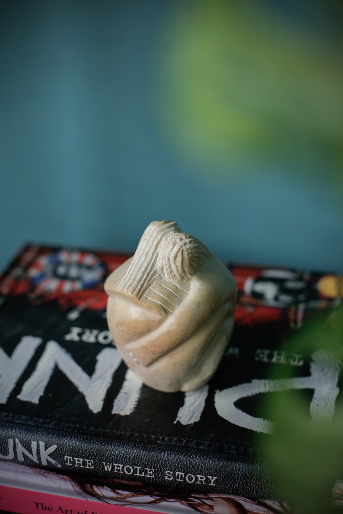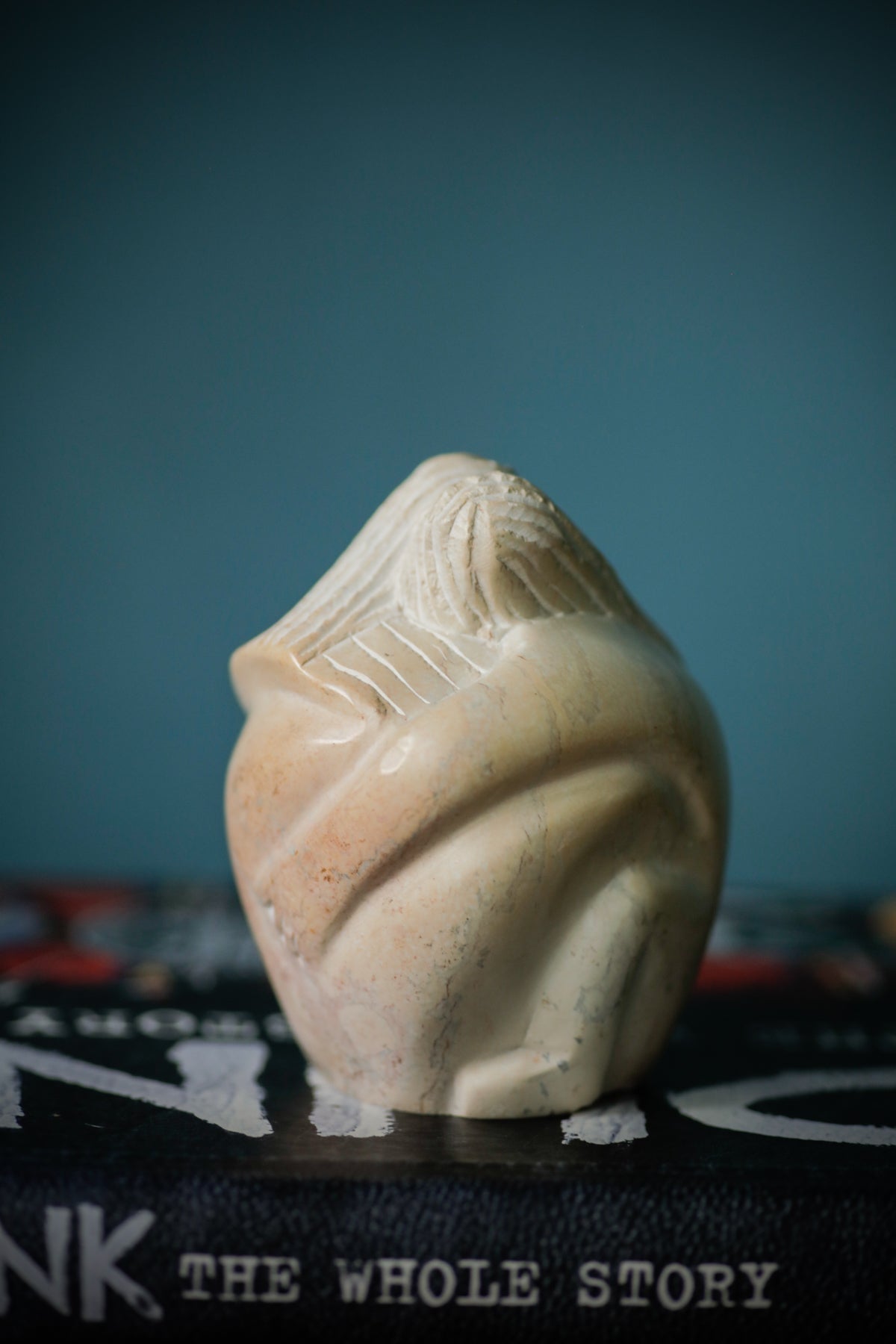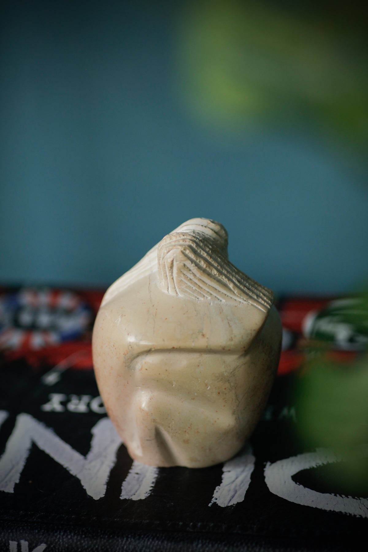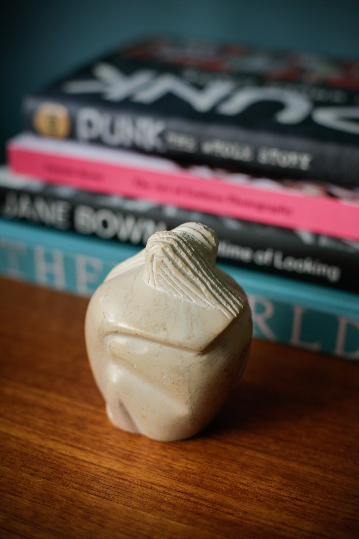 Soapstone is a metamorphic rock that consists of the mineral talc. Also commonly referred to as steatite, it is known for being soft and easy to work with. While the stone was primarily used for domestic purposes such as basketry and pottery, it is now used to create unique handmade carvings. This would be a wonderful sculpture to adorn or home or collection.