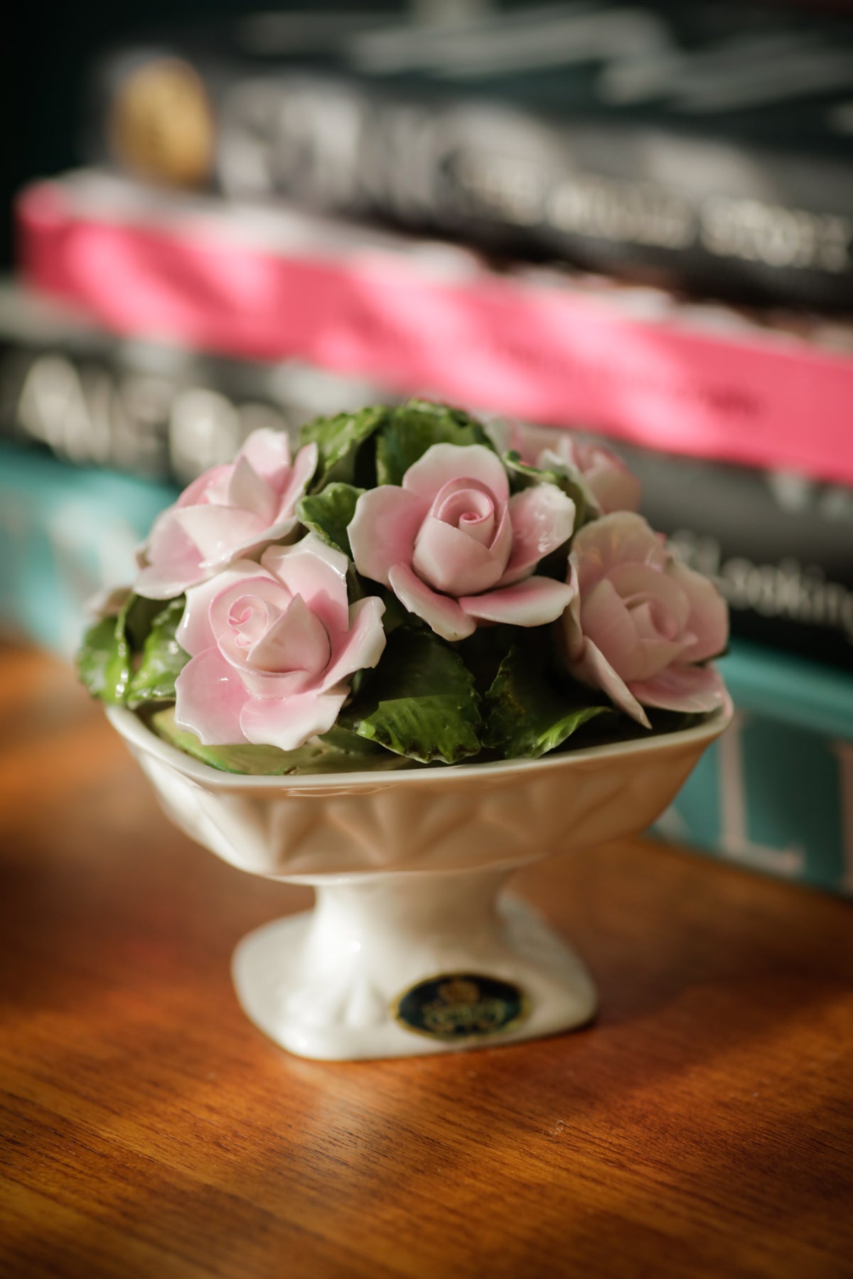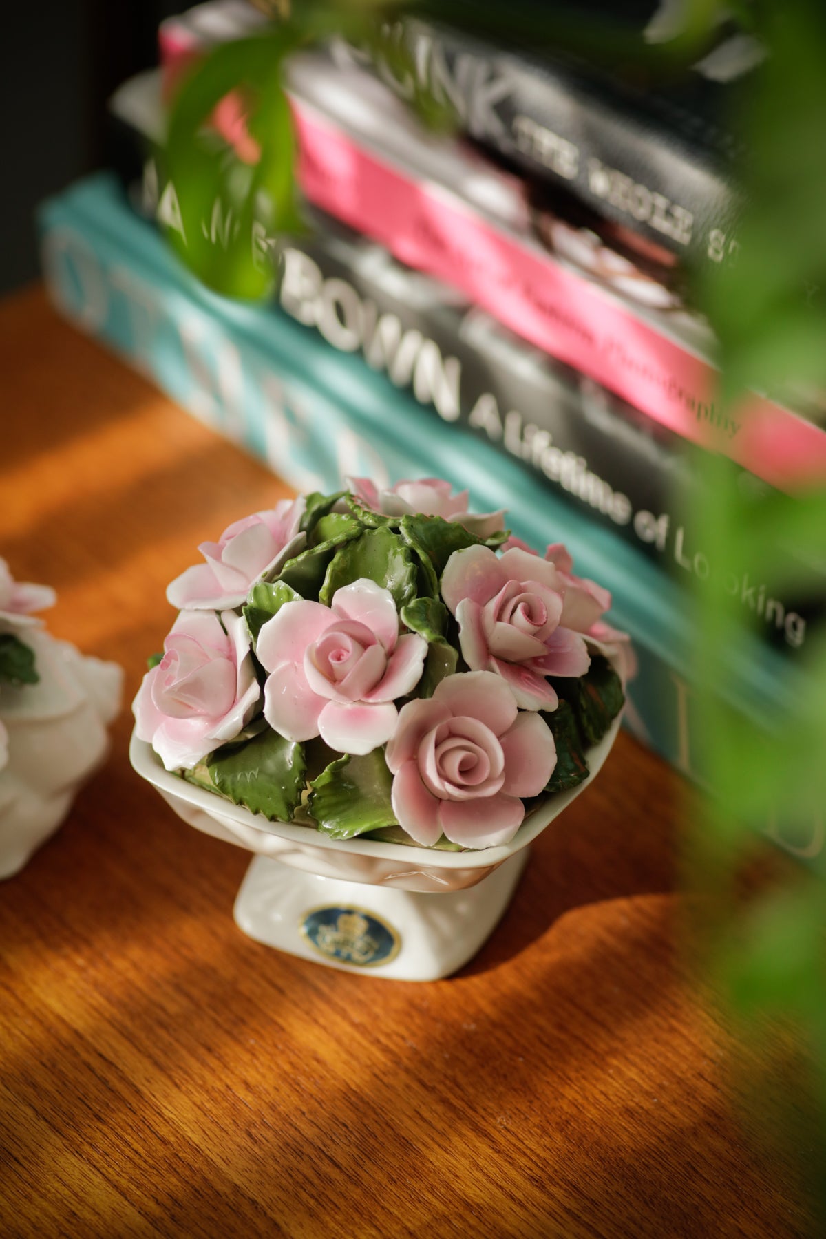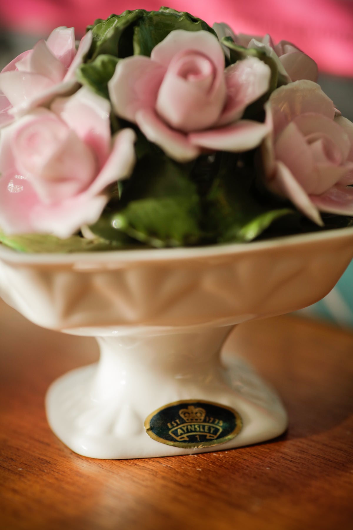 Vintage Aynsley Finebone China Pink Roses in a Basket Figurine Sculpture