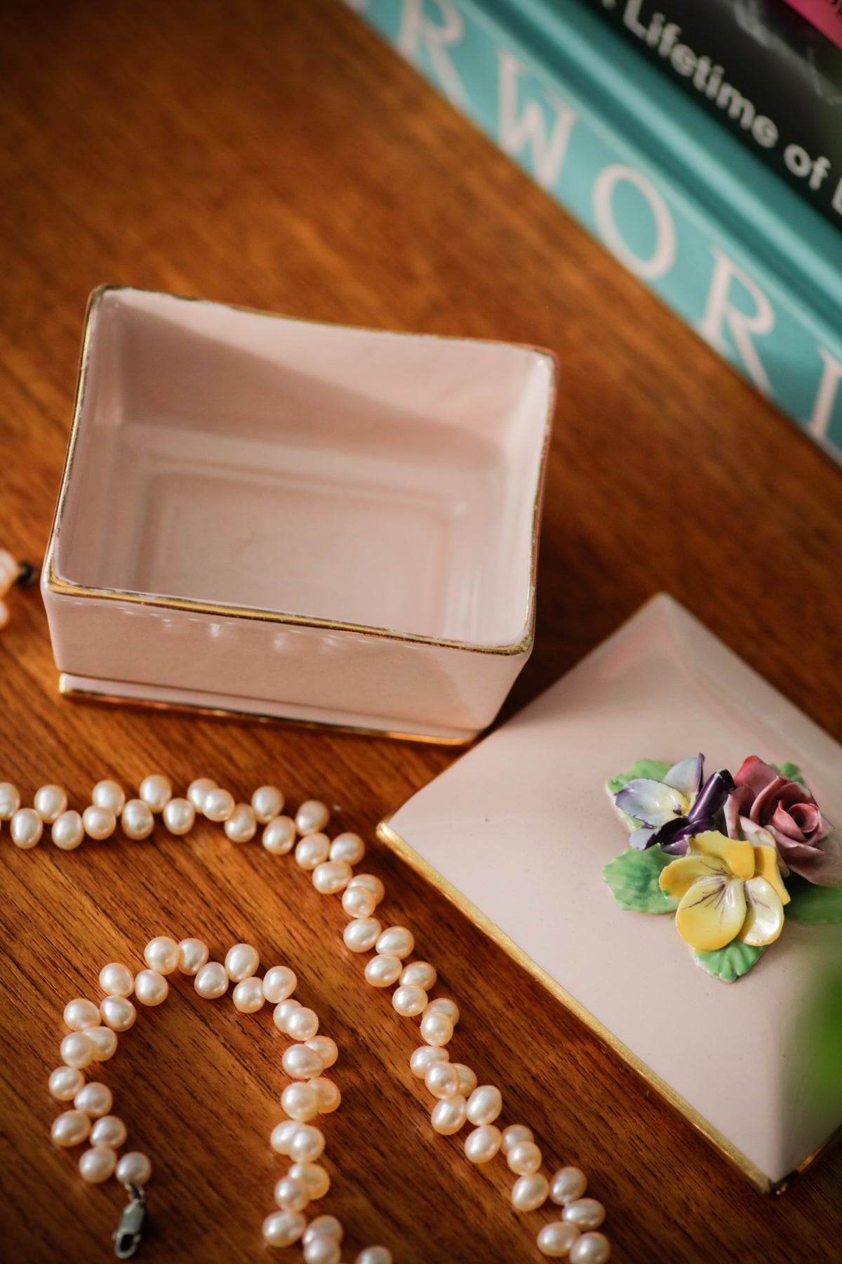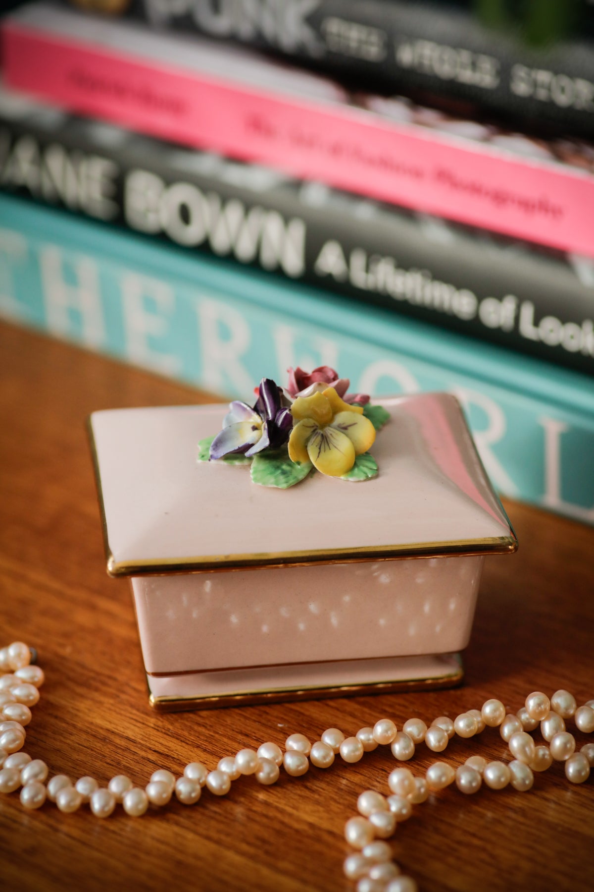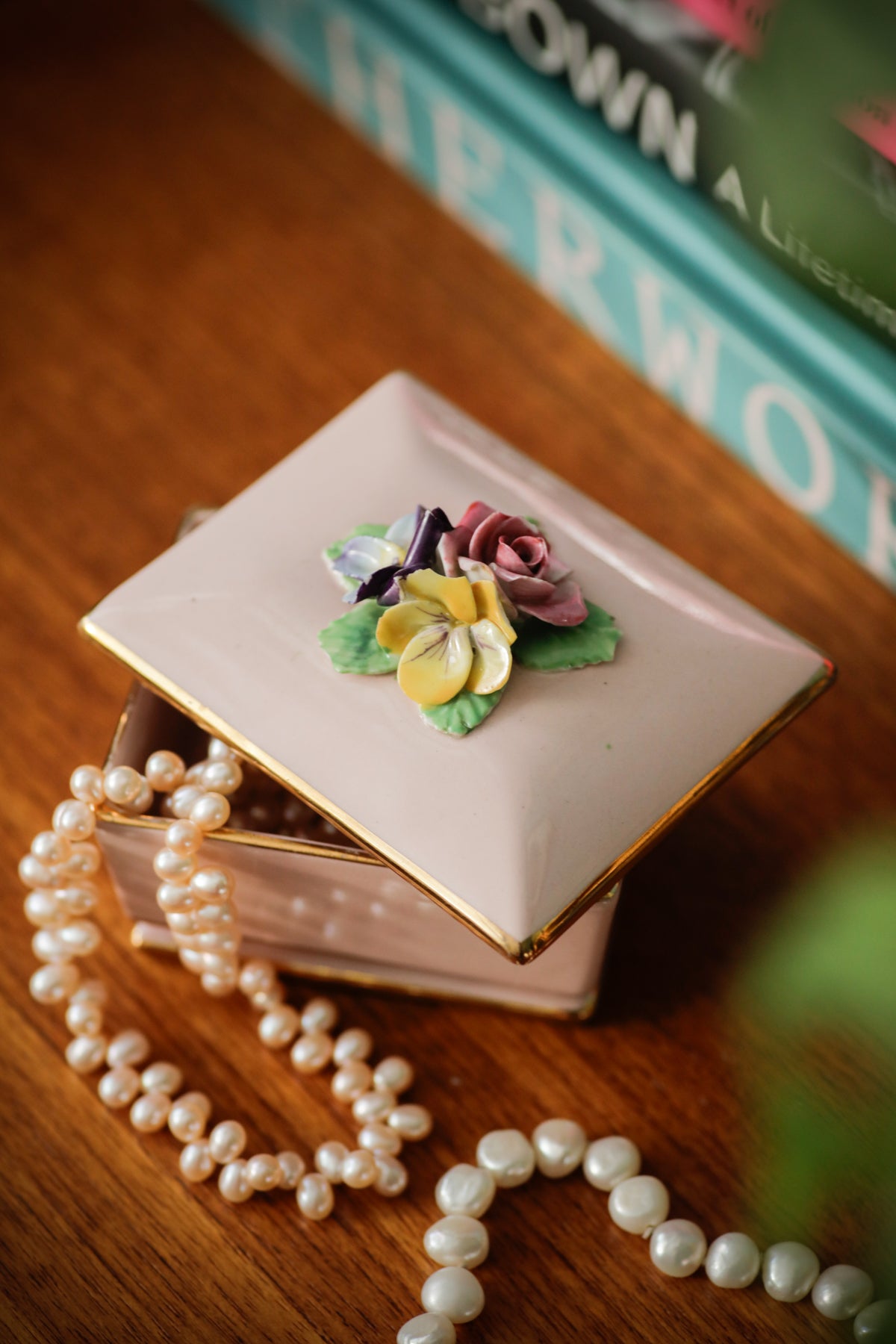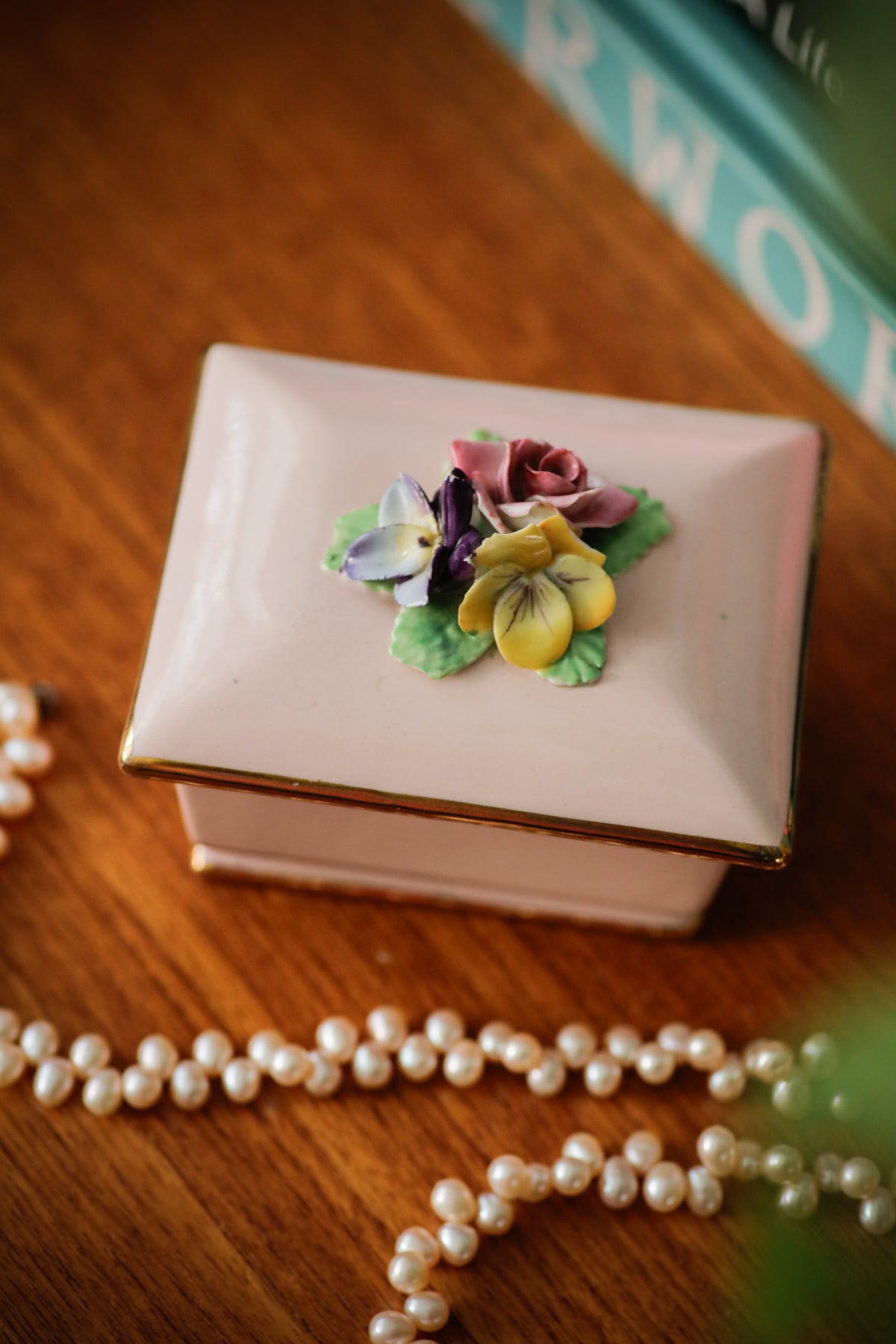 Vintage Porcelain Pink Floral Jewellery Box '80s