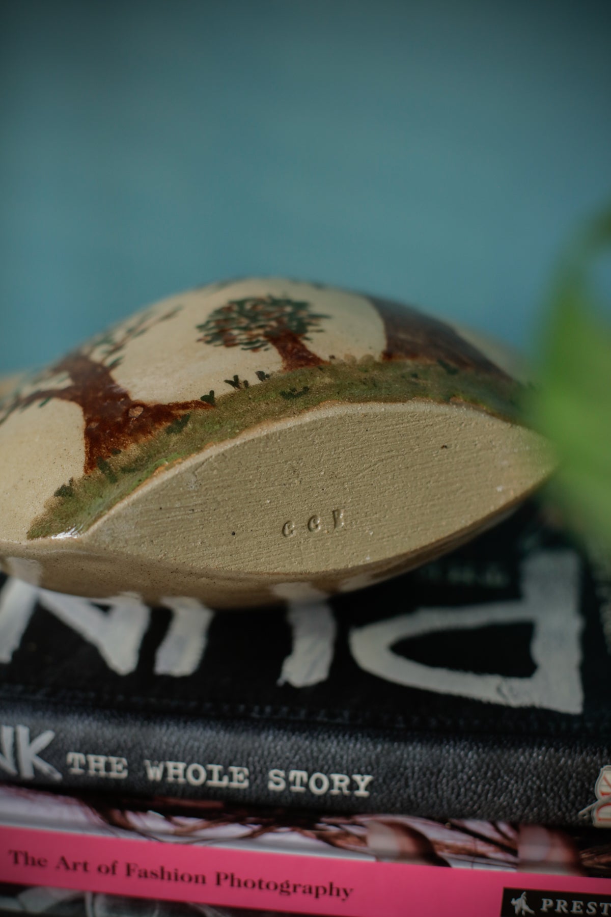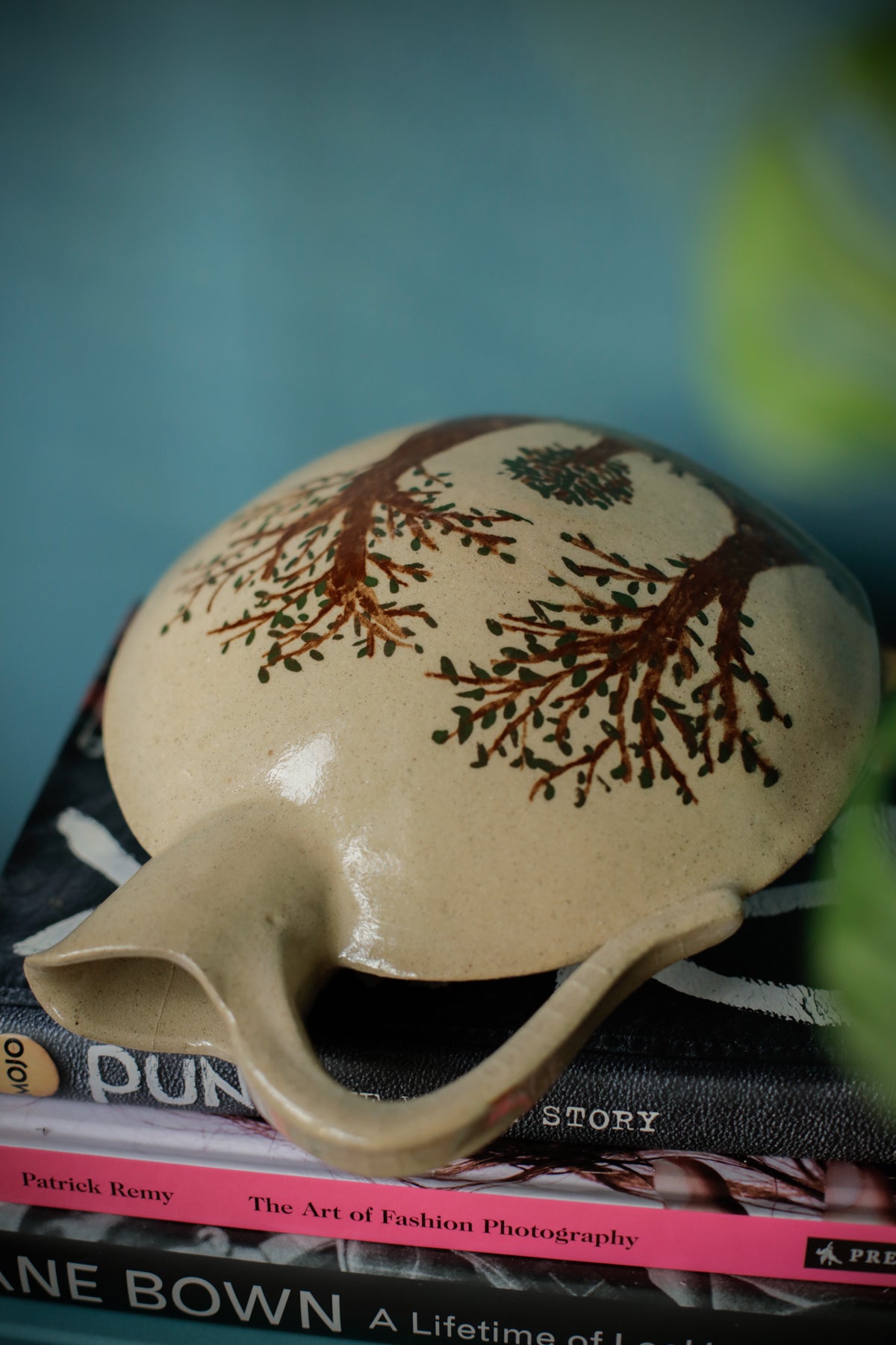 Beautiful stoneware jug with trees painted on the front. Studio Pottery handmade, has a CCB stamped on the bottom, but I cannot identify the maker.