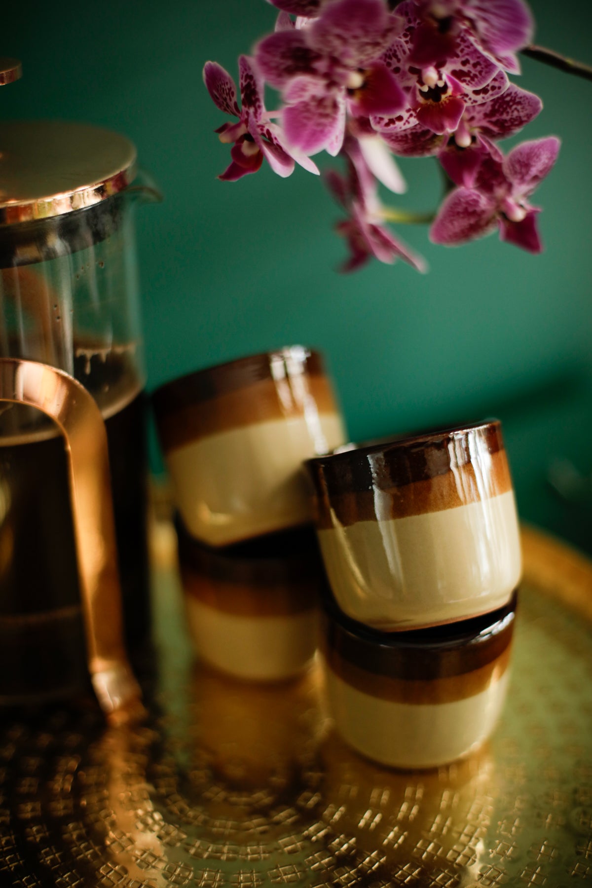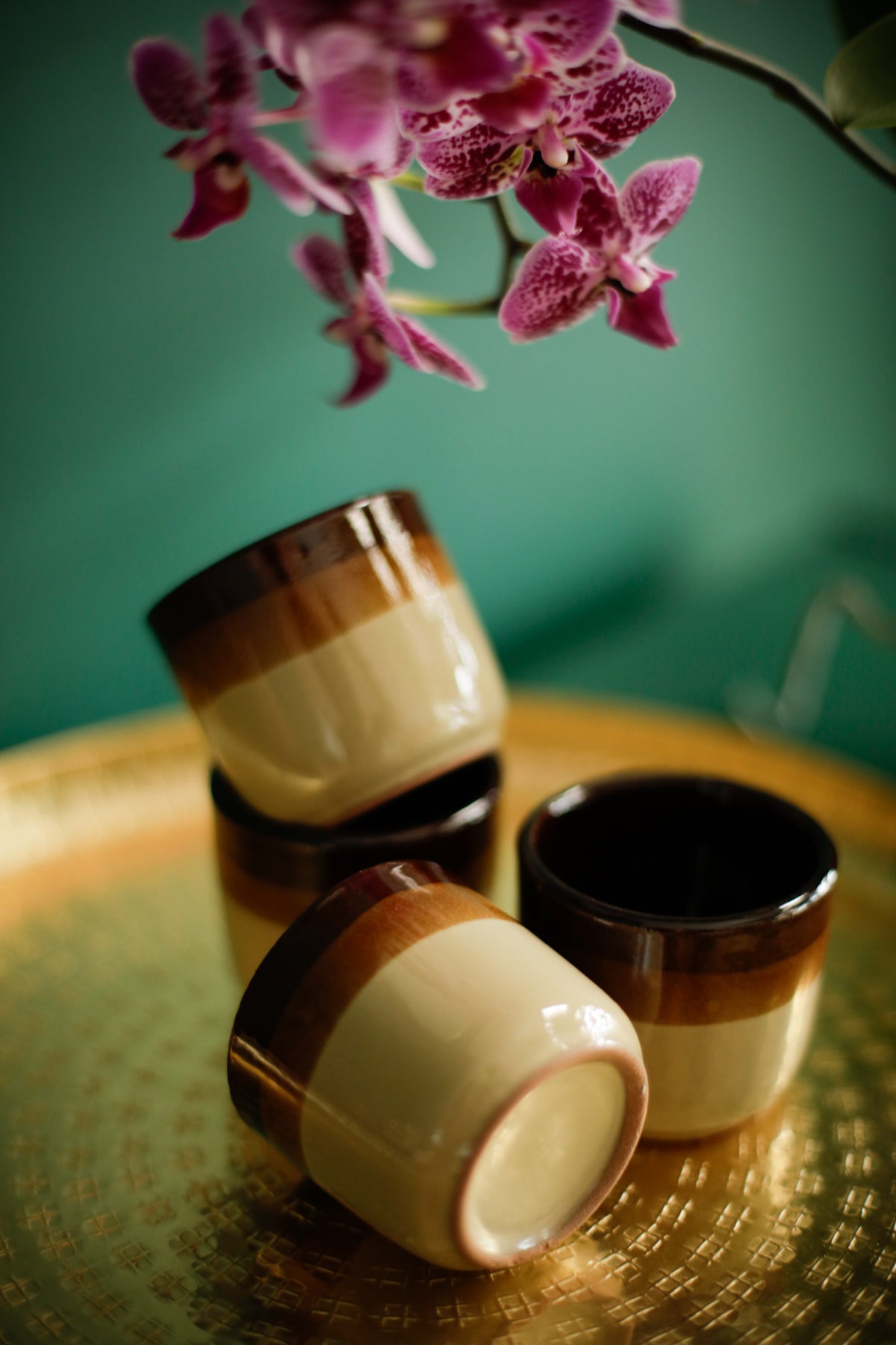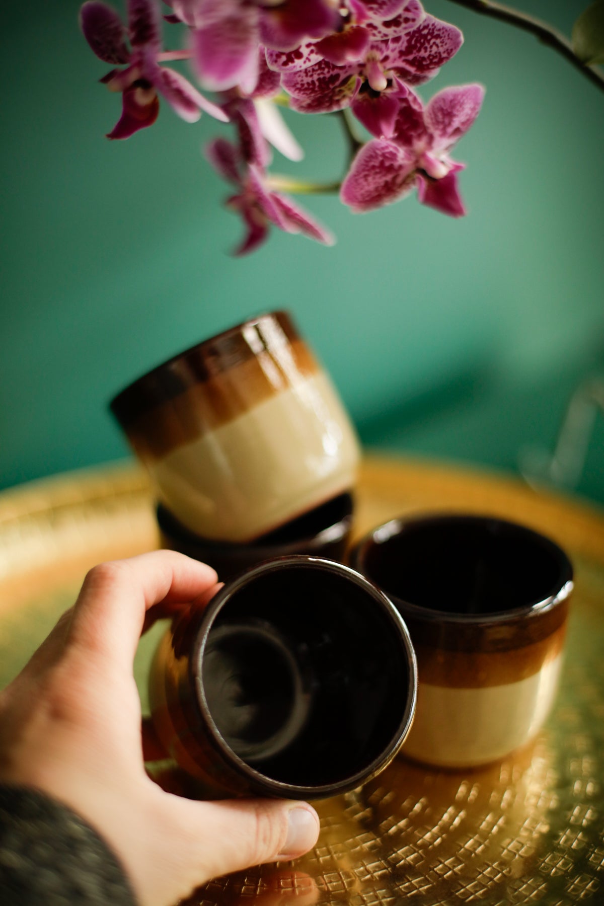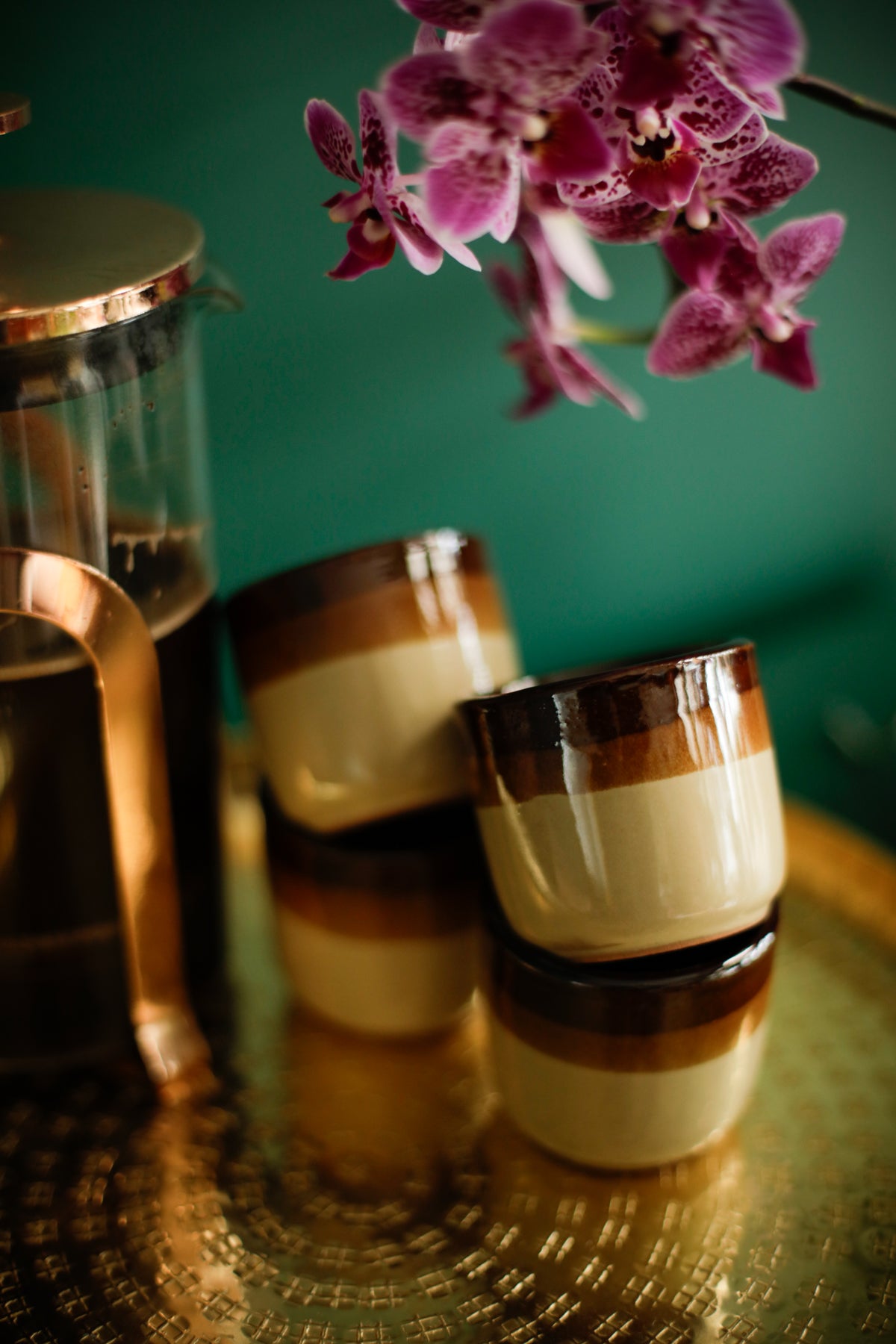 Gorgeous cups featuring a dark brown interior with a two-tone design with brown bands and a beige lower section. Great for serving hot beverages such as coffee tea or hot chocolate, but also can be used for shots of liquors etc.