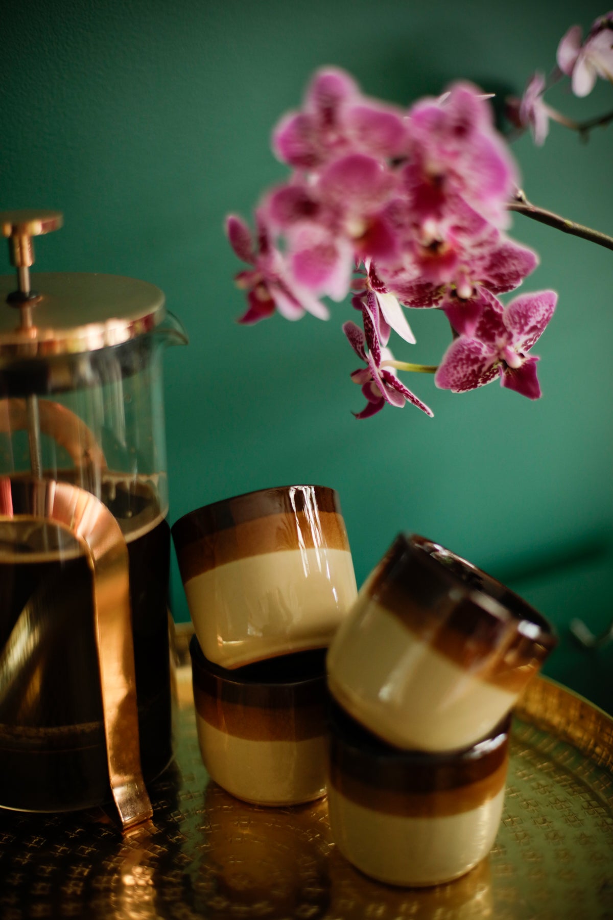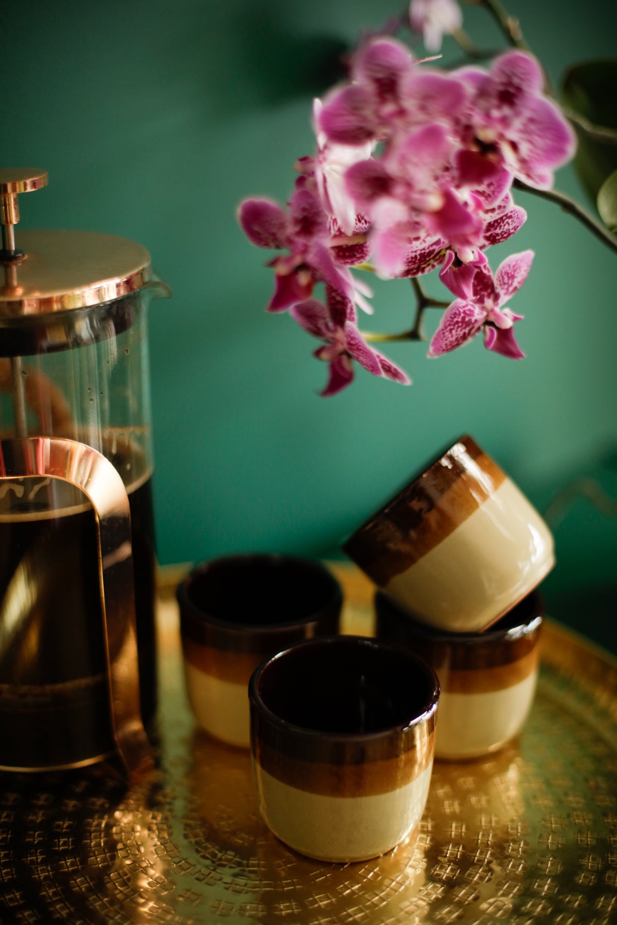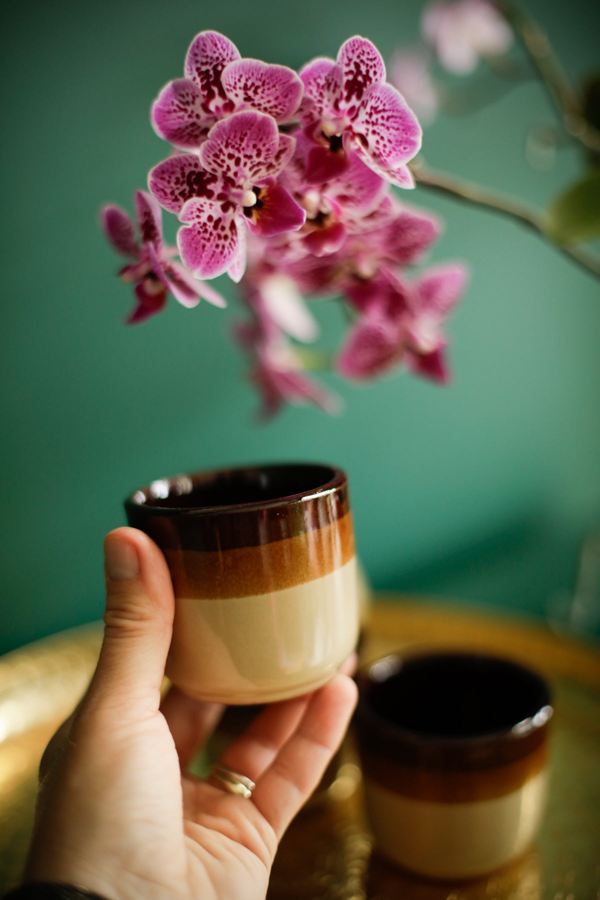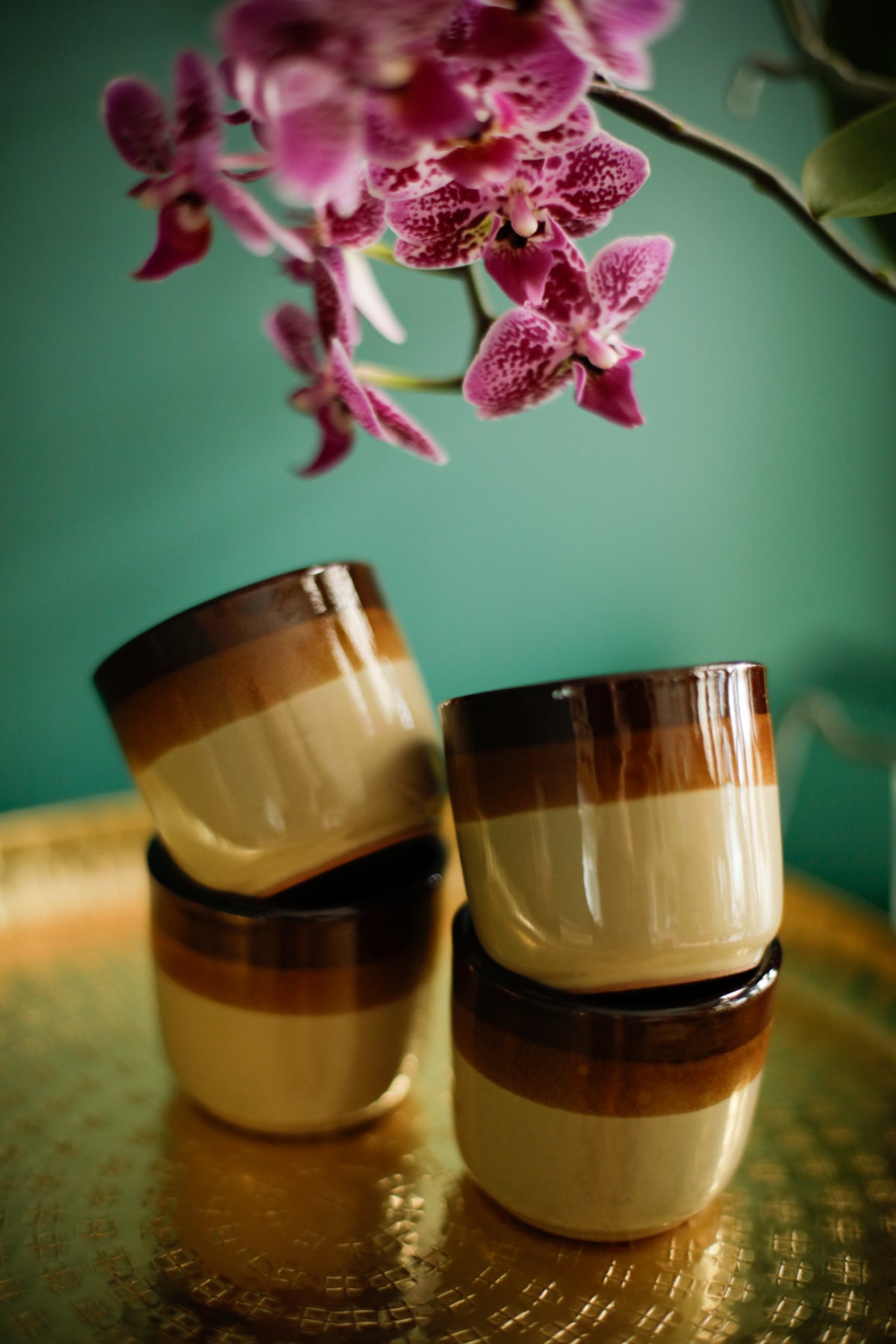 Gorgeous cups featuring a dark brown interior with a two-tone design with brown bands and a beige lower section. Great for serving hot beverages such as coffee tea or hot chocolate, but also can be used for shots of liquors etc.