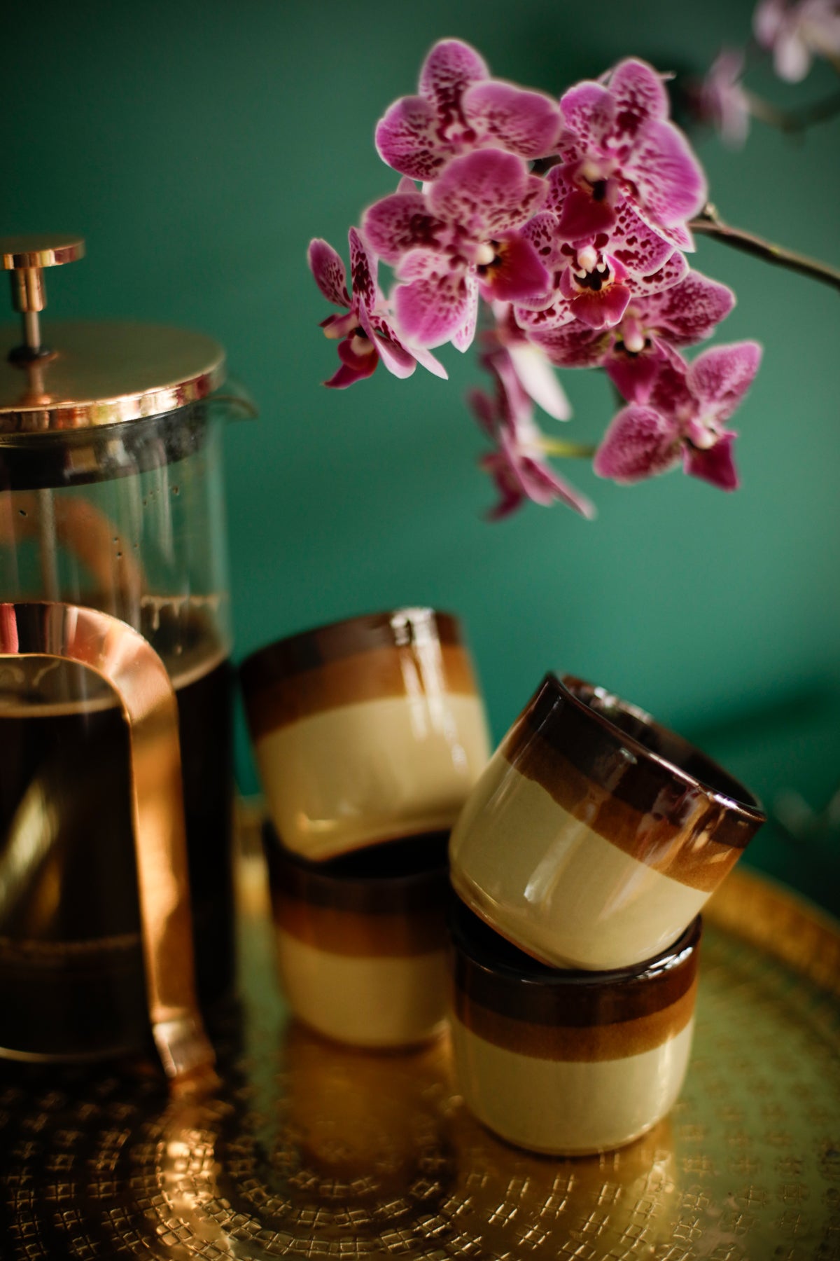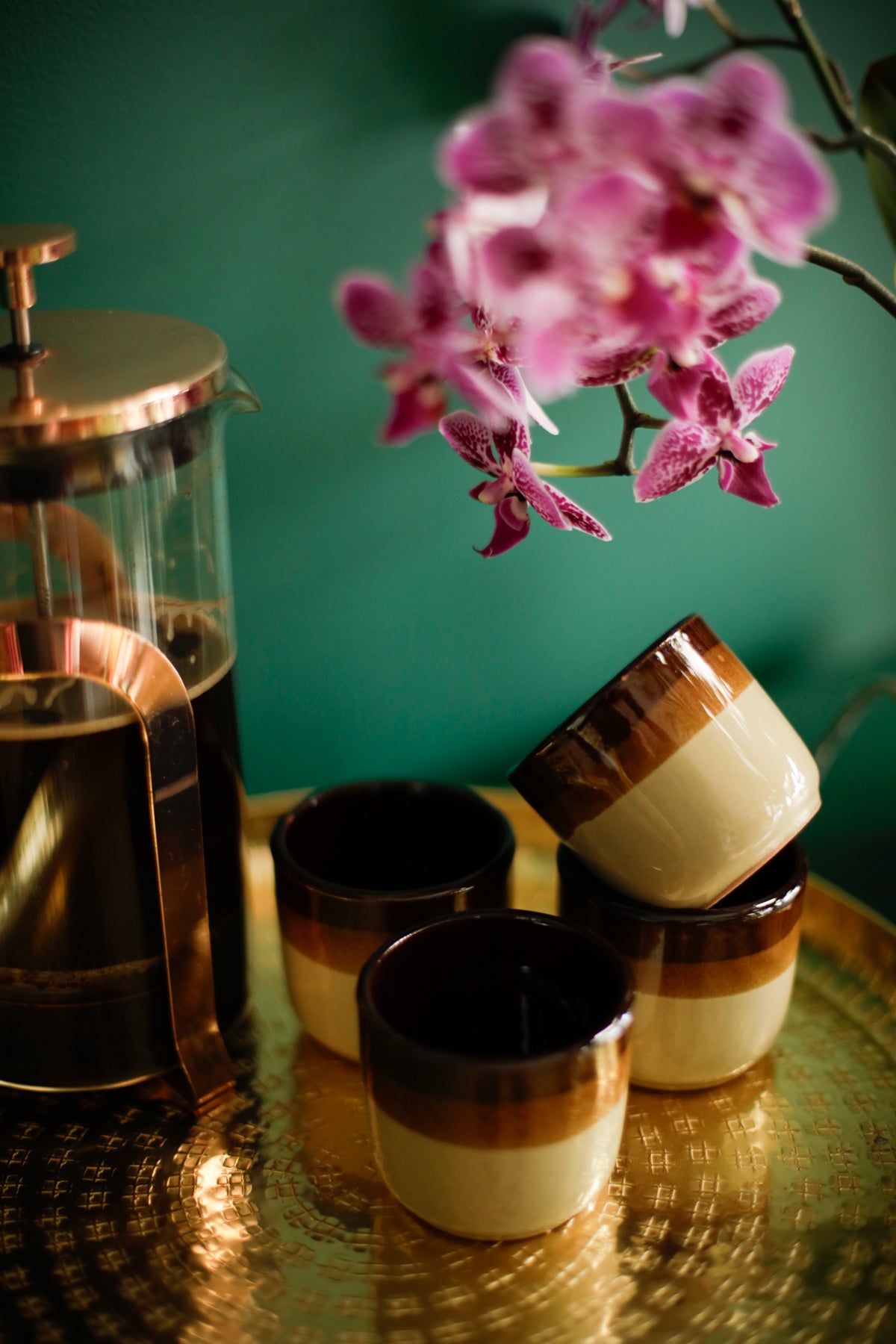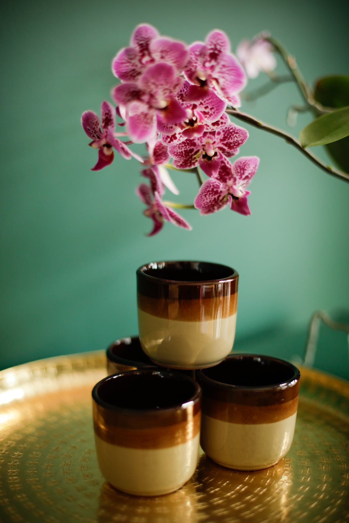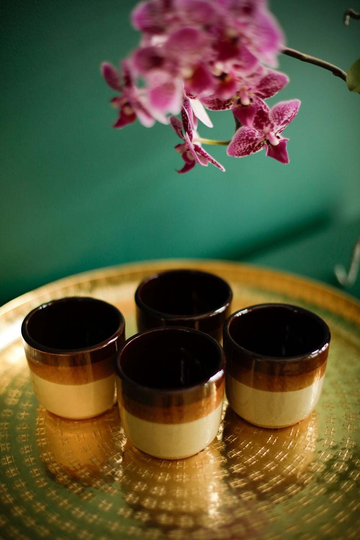 Gorgeous cups featuring a dark brown interior with a two-tone design with brown bands and a beige lower section. Great for serving hot beverages such as coffee tea or hot chocolate, but also can be used for shots of liquors etc.