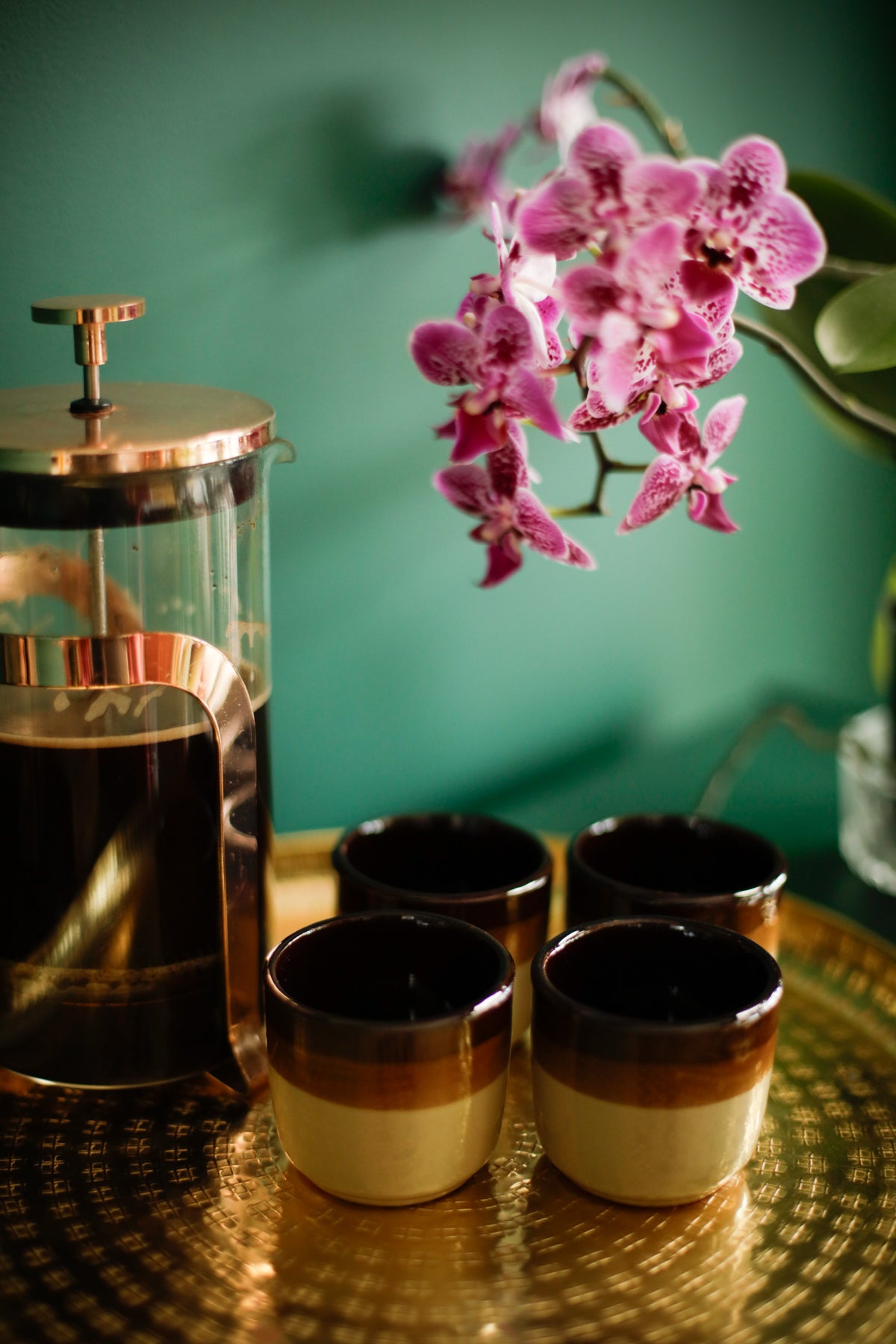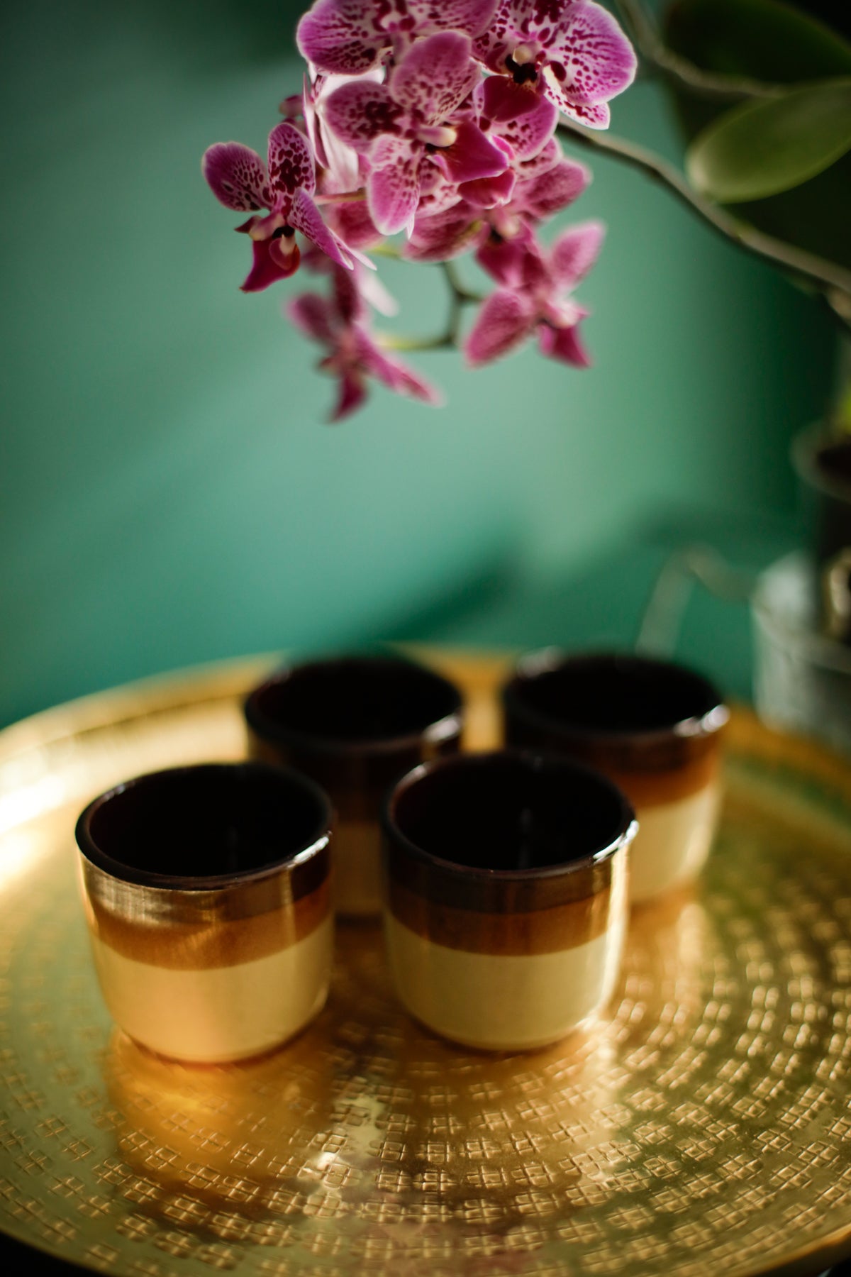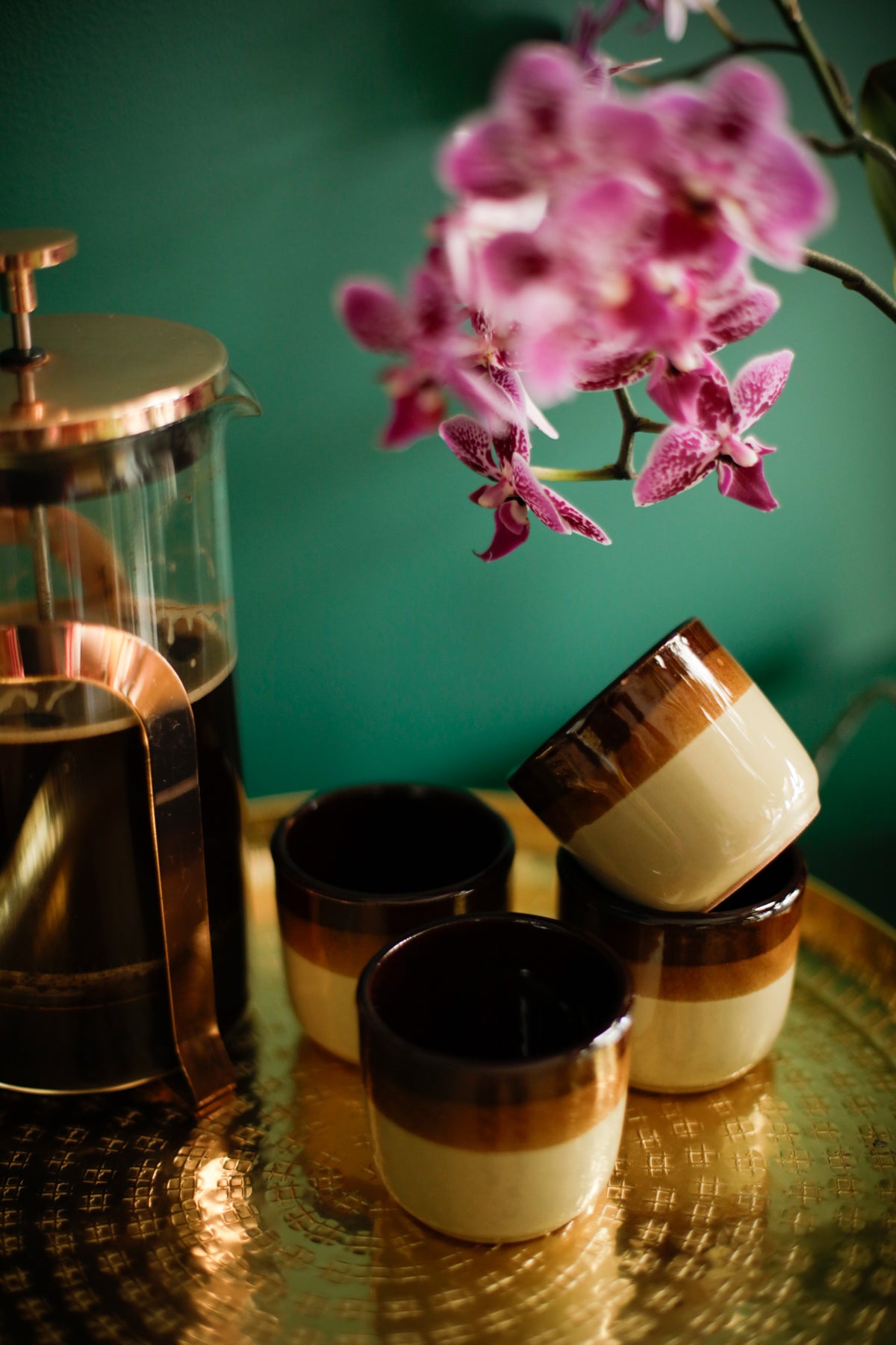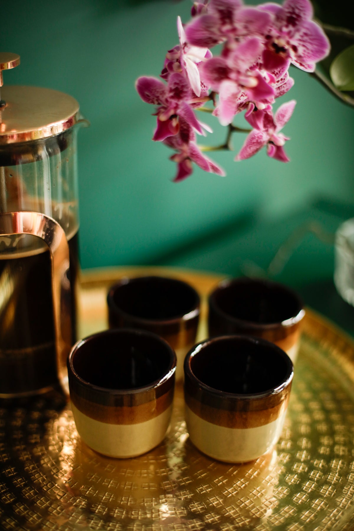 Gorgeous cups featuring a dark brown interior with a two-tone design with brown bands and a beige lower section. Great for serving hot beverages such as coffee tea or hot chocolate, but also can be used for shots of liquors etc.
